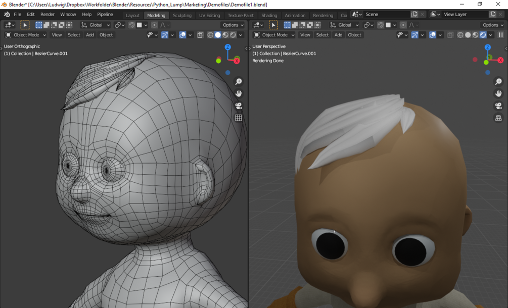 Kami helps you creating hair in a manga/anime style. Kami is found in the N-panel (the right panel in the 3d view port) with the best tools to make hair creation easier. It is also a great start for sculpting. Kami uses custom bevel profiles for curves so you will need Blender 2.91 and up.